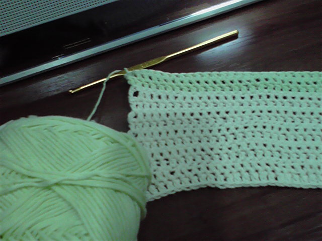 長編みでひたすら長方形に編んでるだけです。旦那が「俺この色好き」といった若草色と生成りのオーガニックコットンで縞々に編んでます。